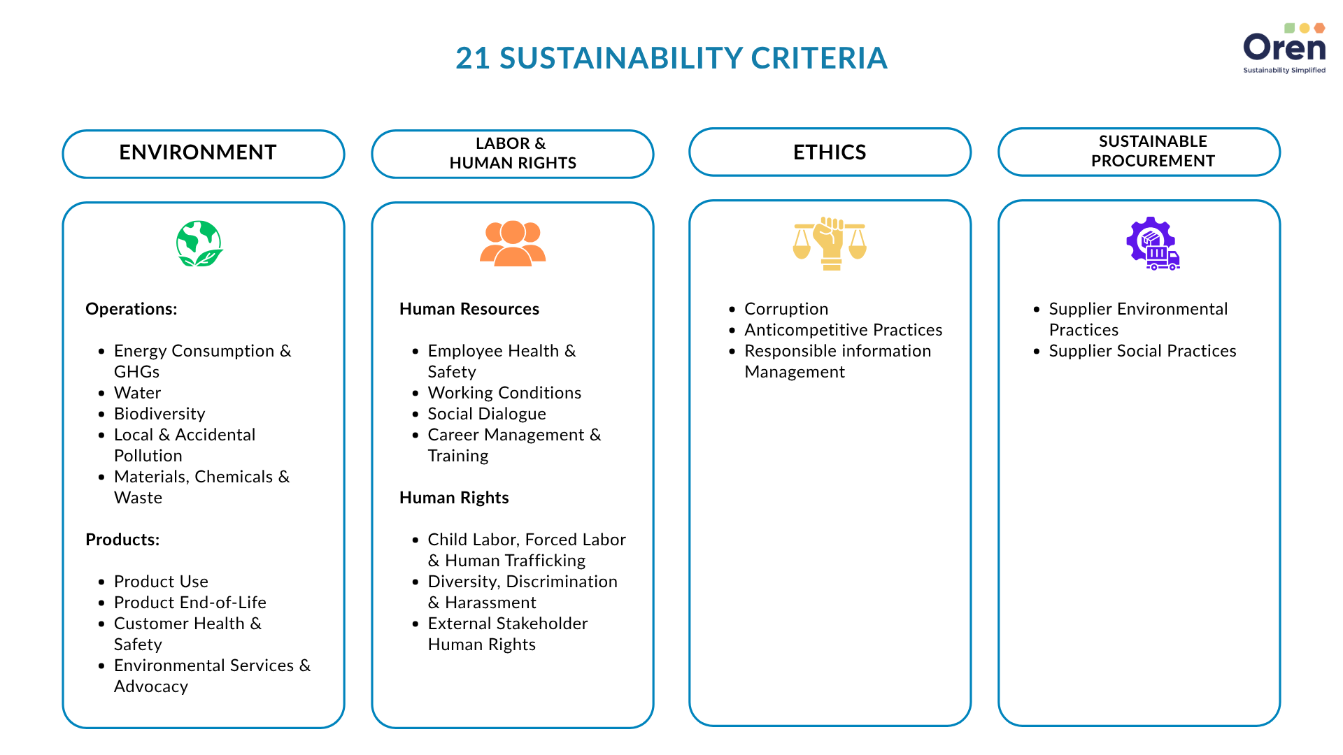 - Strategic improvement: Oren guides companies with actionable steps to enhance policies, processes and reporting. We ensure meaningful progress in sustainability practices that aligns with the companies’ long-term ESG strategy and isn’t just a tick-in-the-box activity for the EcoVadis assessment.